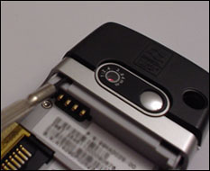 2. Take the small Phillips screwdriver and put it through the small rectangular opening located above the battery compartment on the right side and push the small black tab inside the opening while pushing up on the top cover until the cover pops up a little, then do the same to the opening on the left side. Note: I used a S1.5 slotted screwdriver.