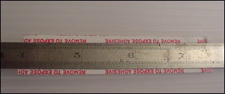 9. Place a long strip of 3M Scotch Poster Tape on a glass or plastic surface and cut 4 3mm strips, 2 strips 3.5cm in length and 2 strips 5cm in length using the utility knife and the ruler.